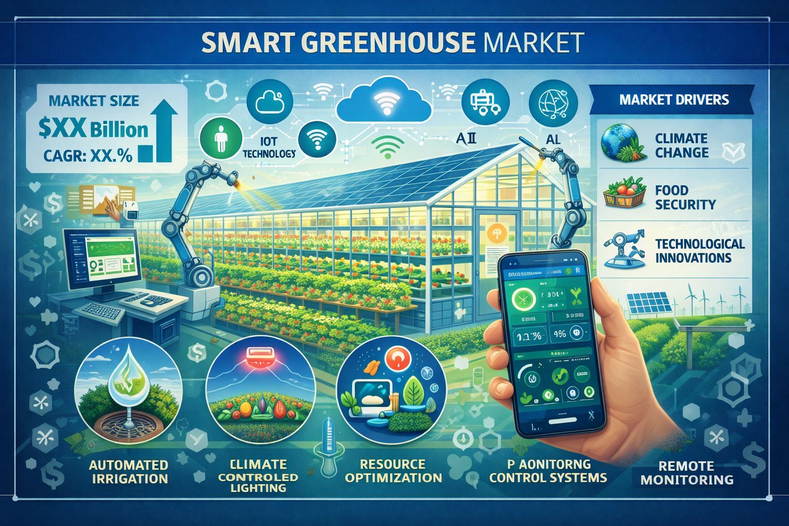 The smart greenhouse market is segmented across four dimensions. By type, the market is divided into hydroponic and non-hydroponic systems. Hydroponic smart greenhouses — in which plants are grown in nutrient-enriched water rather than soil — are gaining significant traction for high-value horticultural crops including leafy greens, herbs, strawberries, and tomatoes, where the precise control of nutrient delivery enabled by hydroponic systems translates directly into improved yield quality and consistency.