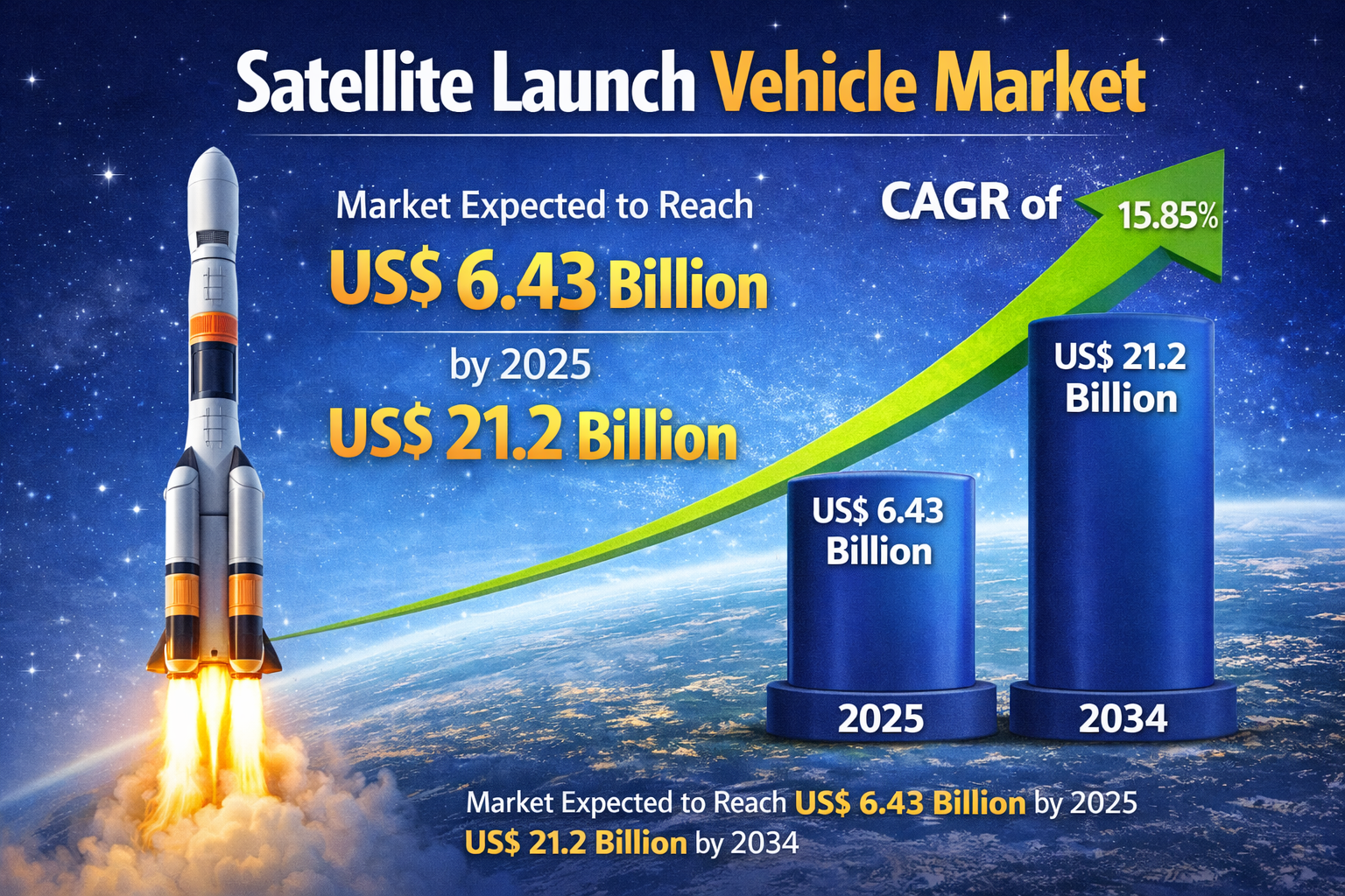 The Satellite Launch Vehicle Market is experiencing robust expansion, fueled by rising satellite deployments, commercial space exploration, and government-backed space programs. According to industry analysis, the market size is projected to reach US$ 6.43 Billion in 2025 and is anticipated to grow significantly to US$ 21.2 Billion by 2034, registering a strong CAGR of 15.85% during the forecast period (2026–2034). The growing integration of satellite technologies across communication, navigation, meteorology, earth observation, and scientific research is driving consistent demand for reliable and cost-effective launch services.