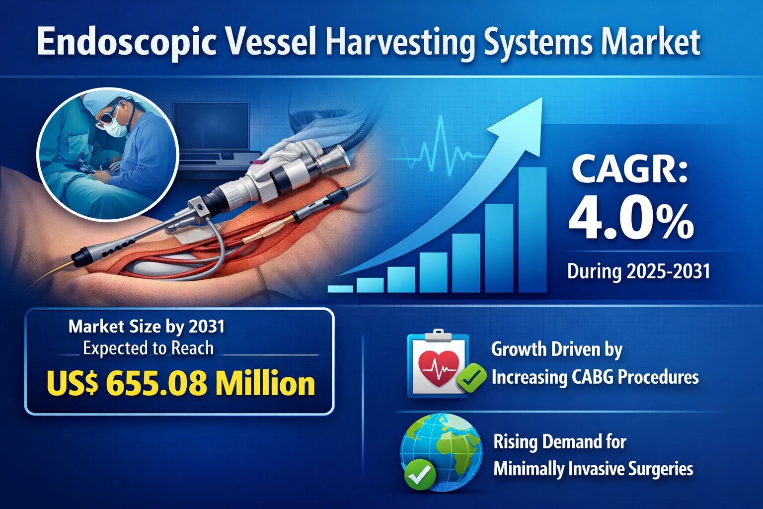 The Endoscopic Vessel Harvesting Systems Market is poised for steady expansion, with its size projected to reach US$ 655.08 million by 2031. The industry is anticipated to register a CAGR of 4.0% during 2025 to 2031. Growth is supported by increasing adoption of minimally invasive surgical techniques and the rising prevalence of cardiovascular disorders worldwide. Hospitals and cardiac centers are increasingly shifting toward advanced harvesting systems that reduce surgical trauma and improve patient recovery timelines.