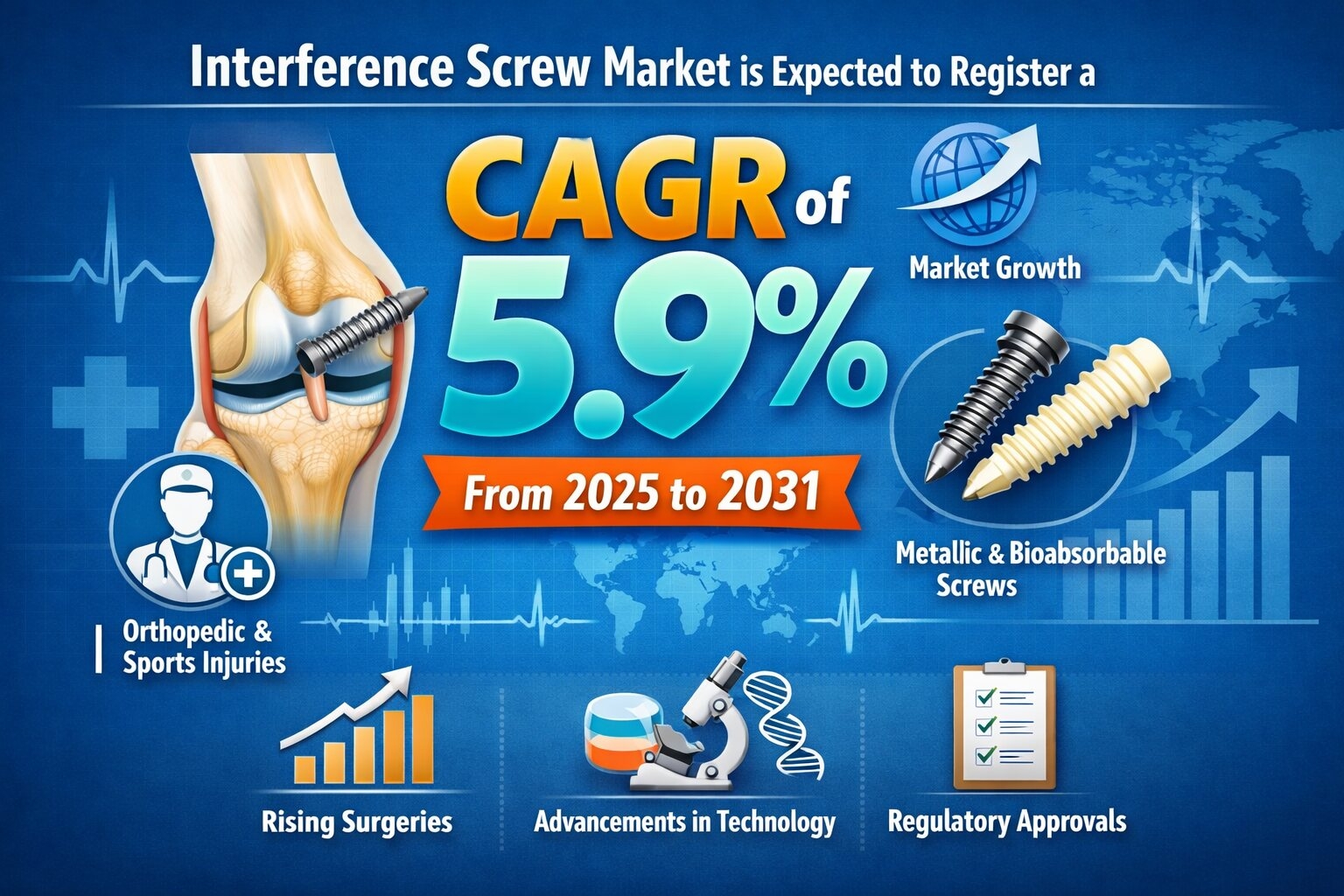 The Interference Screw Market is projected to register a CAGR of 5.9% during the forecast period from 2025 to 2031. Interference screws are widely used in orthopedic procedures, particularly in ligament and tendon reconstruction surgeries such as anterior cruciate ligament repair. These devices play a vital role in securing grafts to bone, ensuring stability and promoting effective healing. The growing volume of sports injuries, trauma cases, and degenerative orthopedic conditions continues to support consistent demand across healthcare facilities worldwide.