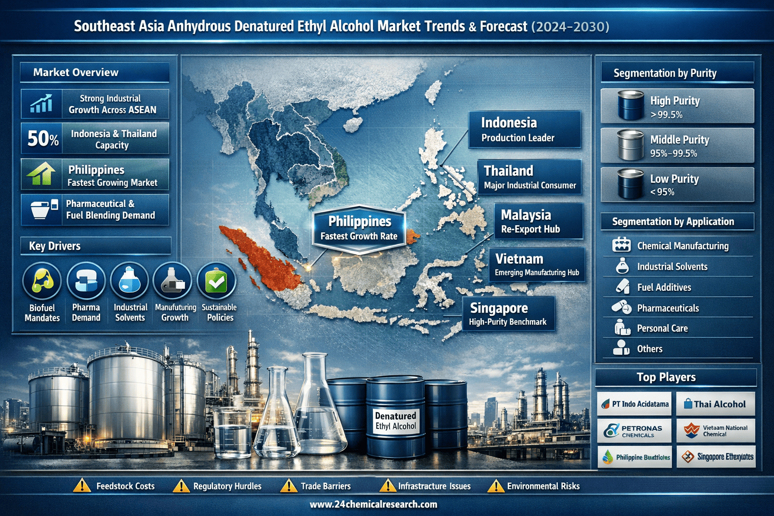 This comprehensive market analysis covers the Southeast Asia anhydrous denatured ethyl alcohol landscape from 2024 through 2030, providing detailed insights into: