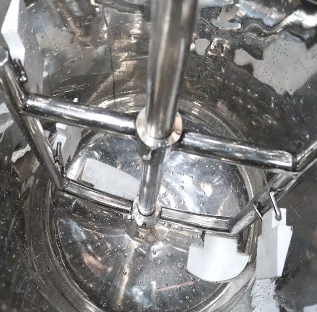 Stainless steel tanks with variable-speed agitators and heating/cooling jackets for uniform mixing of liquids, powders, and additives.
