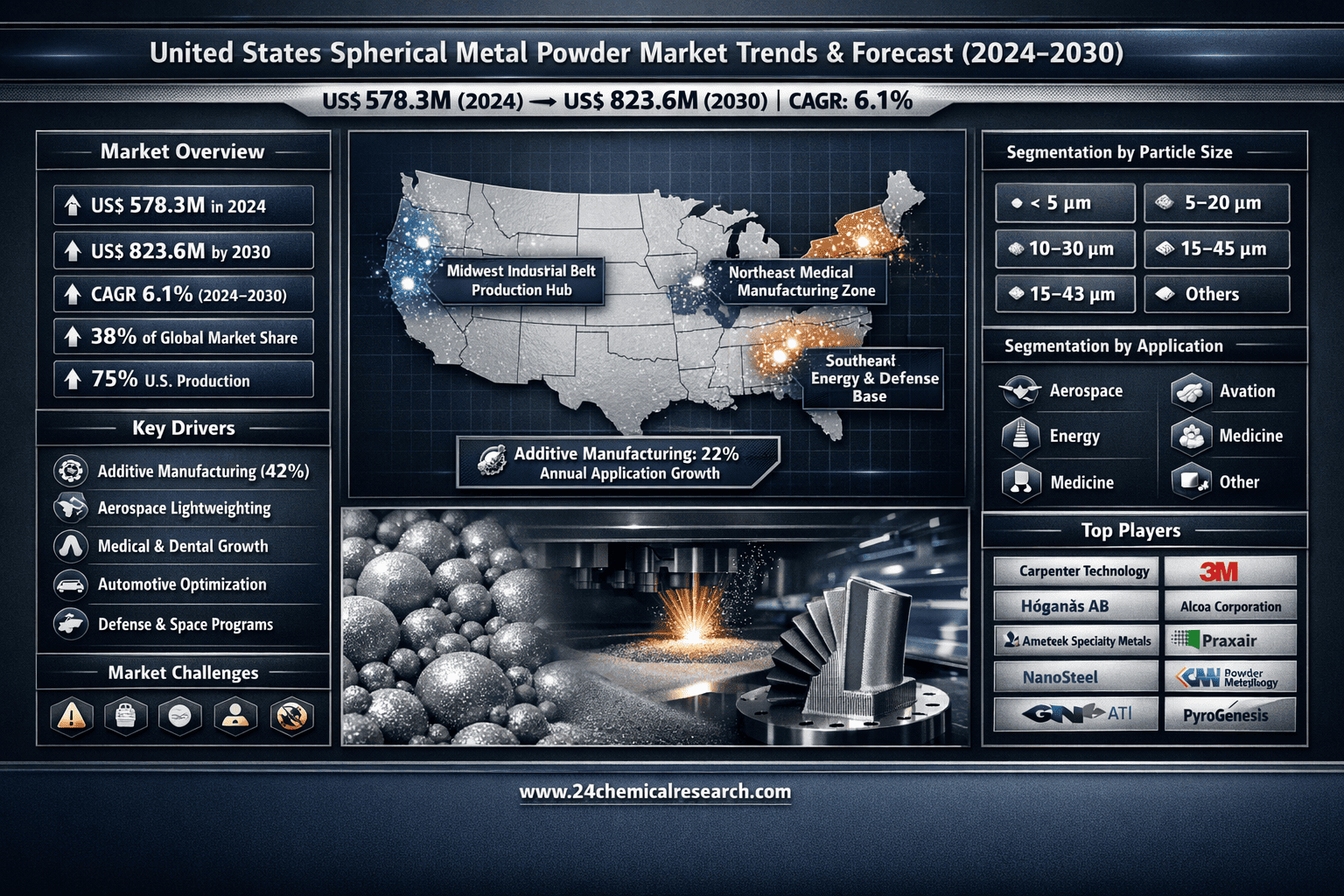 According to 24Chemical Research, United States Spherical Metal Powder market size was valued at USD 578.3 million in 2024 and is projected to reach USD 823.6 million by 2030, at a CAGR of 6.1% during the forecast period 2024-2030.