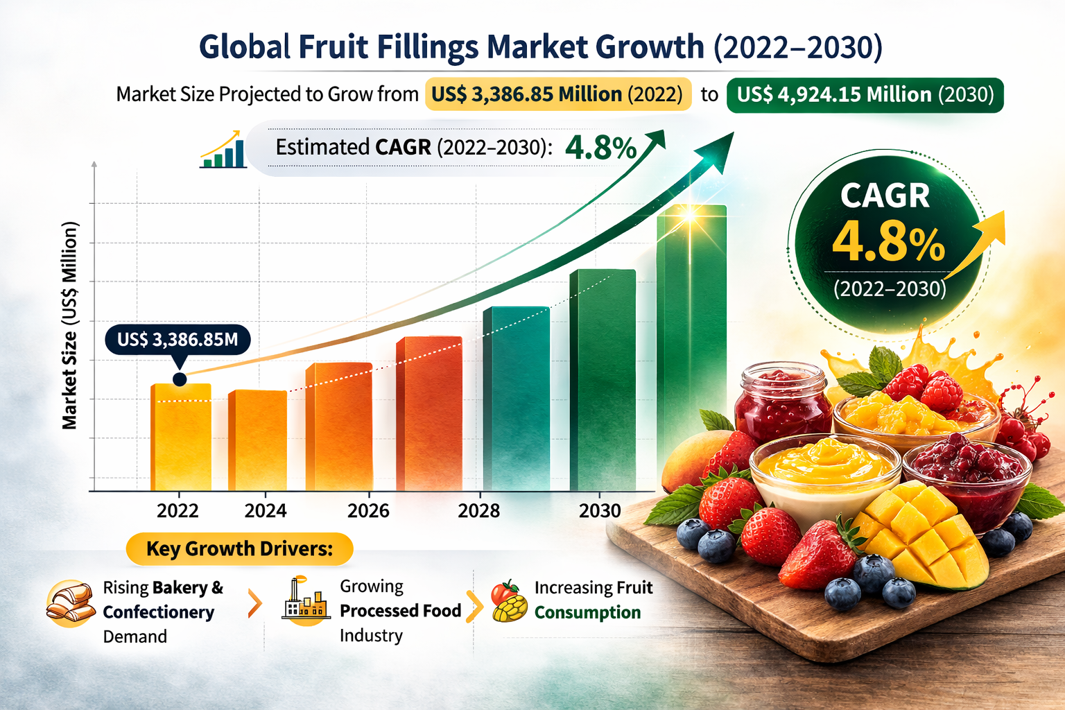 The global fruit fillings market is witnessing steady expansion, driven by evolving consumer preferences and the rapid growth of processed food industries worldwide. The market size is projected to increase from US$ 3,386.85 million in 2022 to US$ 4,924.15 million by 2030, registering a CAGR of 4.8 percent during the forecast period. This growth trajectory reflects rising demand for premium bakery, confectionery, dairy, and ready to eat products that incorporate fruit based ingredients for enhanced flavor, texture, and visual appeal.