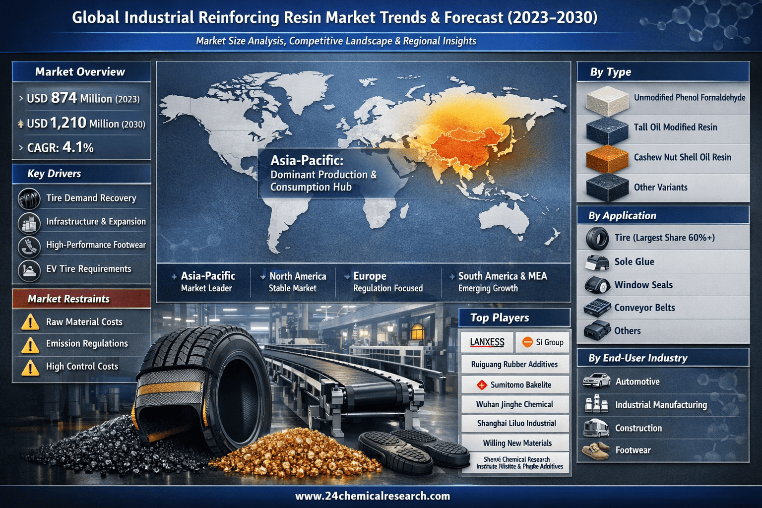 1. Global Automotive Industry Rebound: The resurgence of the global automotive sector is creating intense demand for high-performance tires and sealing components, where reinforcing resins are critical. The tire industry alone, with a projected value of over $300 billion in 2024, is a primary consumer, as these resins enhance the longevity and safety of tread compounds by 25-40% in wear tests, a vital factor as vehicle production volumes recover post-pandemic and electric vehicle adoption accelerates, requiring specialized tire formulations.