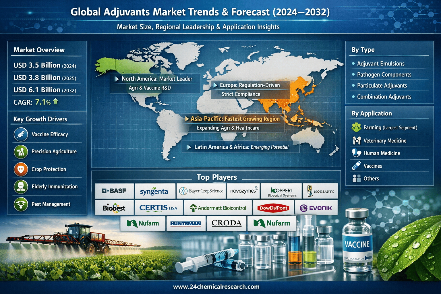 According to 24Chemical Research, Global adjuvants market size was valued at USD 3.5 billion in 2024. The market is projected to grow from USD 3.8 billion in 2025 to USD 6.1 billion by 2032, exhibiting a CAGR of 7.1% during the forecast period.
