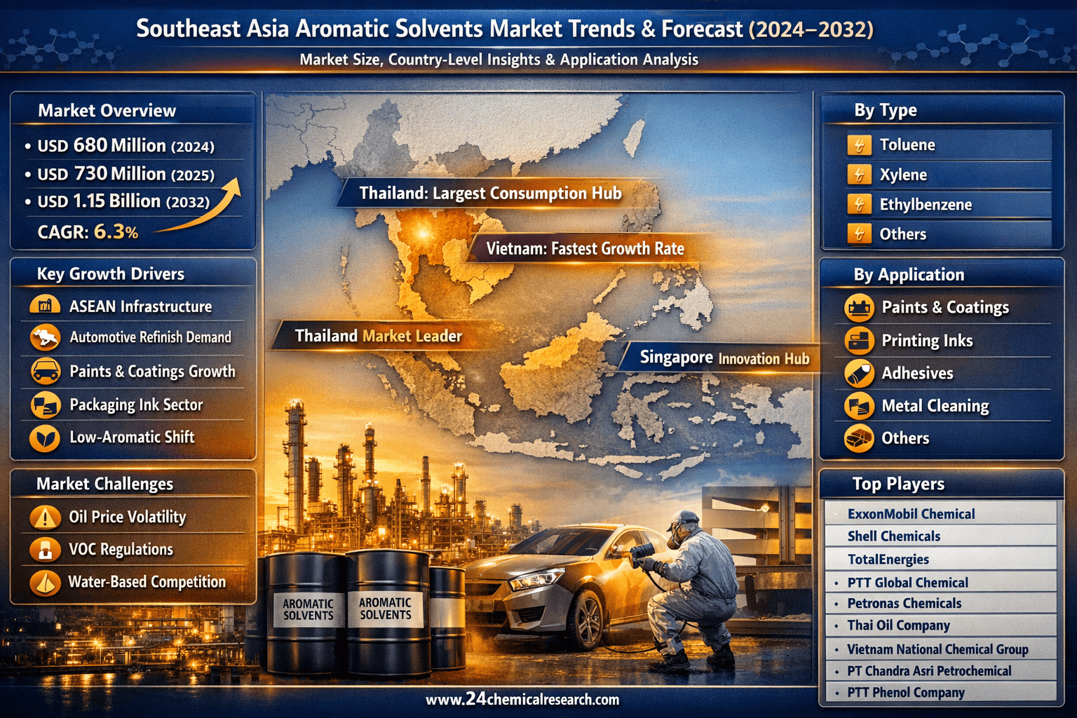 According to 24Chemical Research, Global Southeast Asia Aromatic Solvents market size was valued at USD 680 million in 2024. The market is projected to grow from USD 730 million in 2025 to USD 1.15 billion by 2032, exhibiting a CAGR of 6.3% during the forecast period.