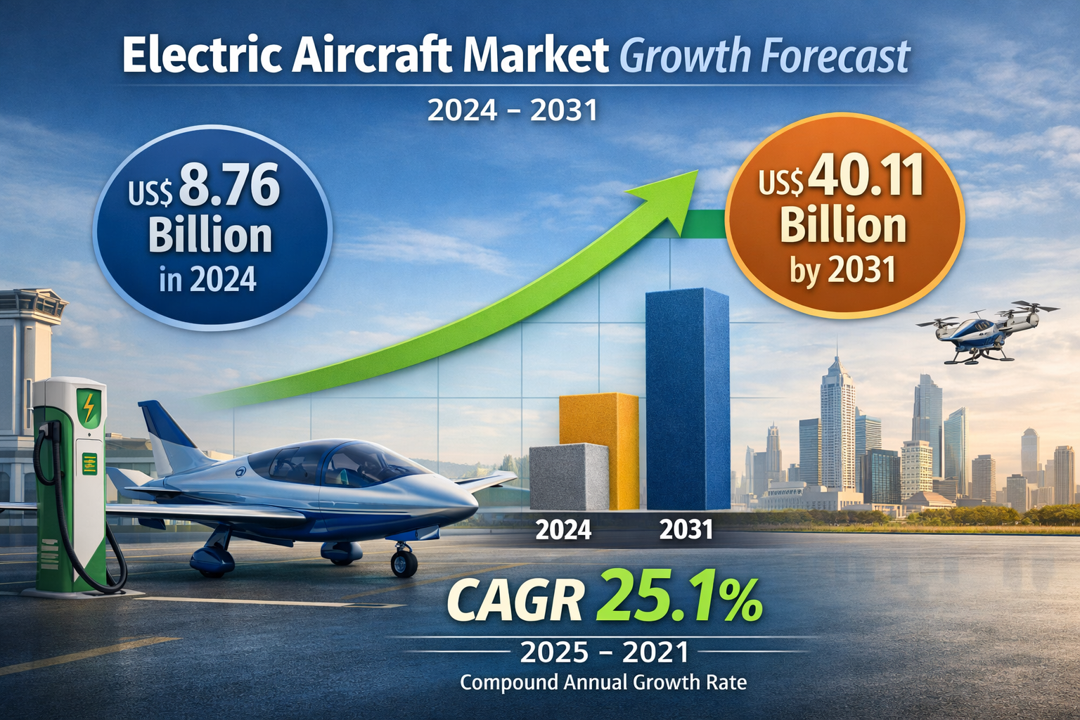 According to industry estimates, the electric aircraft market was valued at US$ 8.76 billion in 2024 and is projected to reach US$ 40.11 billion by 2031, registering a CAGR of 25.1% during the forecast period (2025–2031).The market is gaining significant momentum as the global aviation industry shifts toward sustainable and energy-efficient technologies. Increasing environmental concerns, stricter emission regulations, and advancements in electric propulsion systems are encouraging aerospace companies to invest heavily in electric aviation solutions.