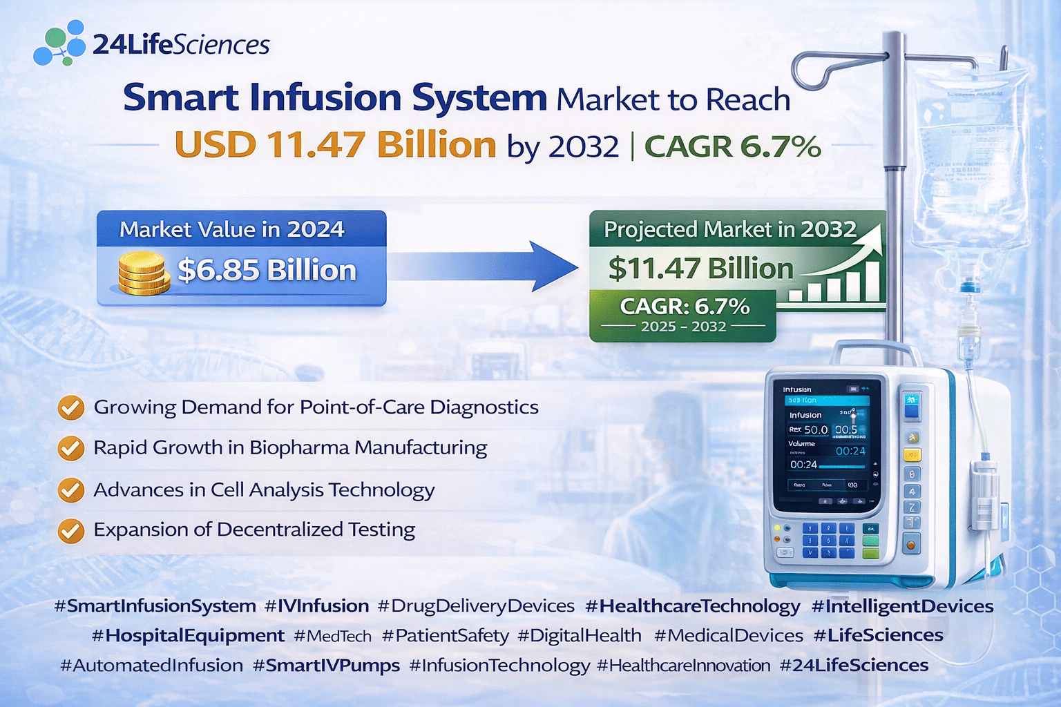 According to a newly published market research report by 24LifeSciences, global smart infusion system market was valued at USD 6.85 billion in 2024 and is projected to reach USD 11.47 billion by 2032, growing at a compound annual growth rate (CAGR) of 6.7% during the forecast period 20252032.