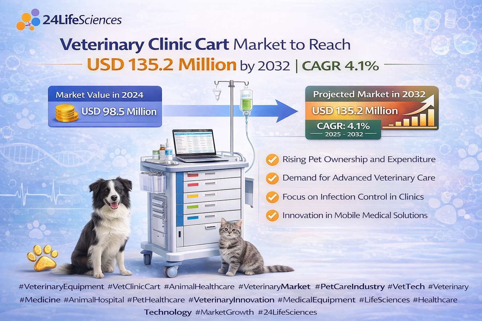 According to a newly published market research report by 24LifeSciences, global veterinary clinic cart market was valued at USD 98.5 million in 2024 and is projected to reach USD 135.2 million by 2032, growing at a compound annual growth rate (CAGR) of 4.1% during the forecast period 2025–2032.