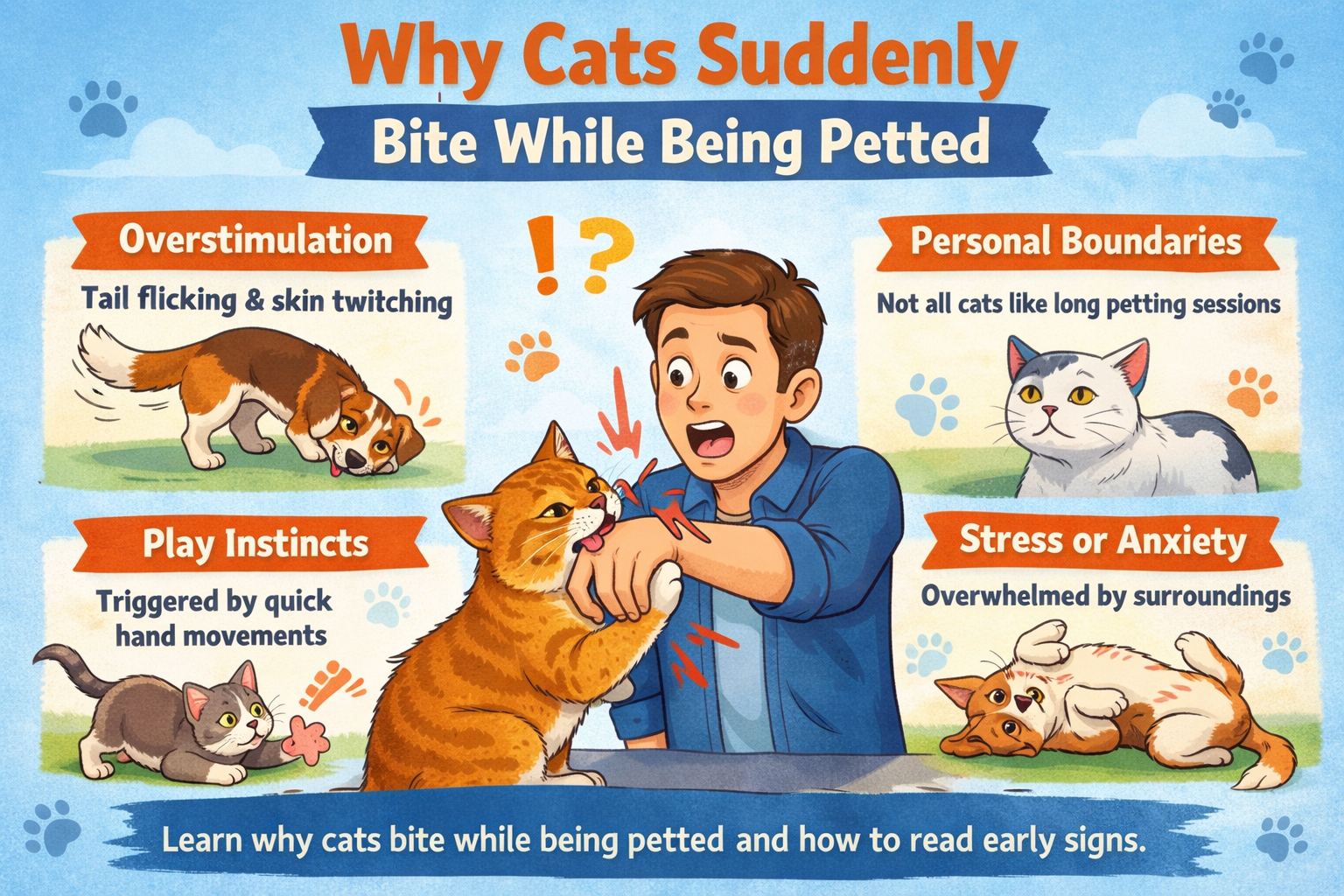 Petting a cat can feel like a peaceful moment. Your cat is purring, relaxed, and enjoying the attention. Then suddenly, without warning, the mood changes and the cat bites your hand. Many owners experience this and wonder the same thing: why do cats suddenly bite while being petted?