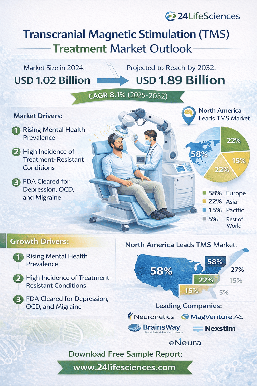 According to a newly published market research report by 24LifeSciences, global Transcranial Magnetic Stimulation (TMS) Treatment market was valued at USD 1.02 billion in 2024 and is projected to reach USD 1.89 billion by 2032, growing at a compound annual growth rate (CAGR) of 8.1% during the forecast period 2025–2032.