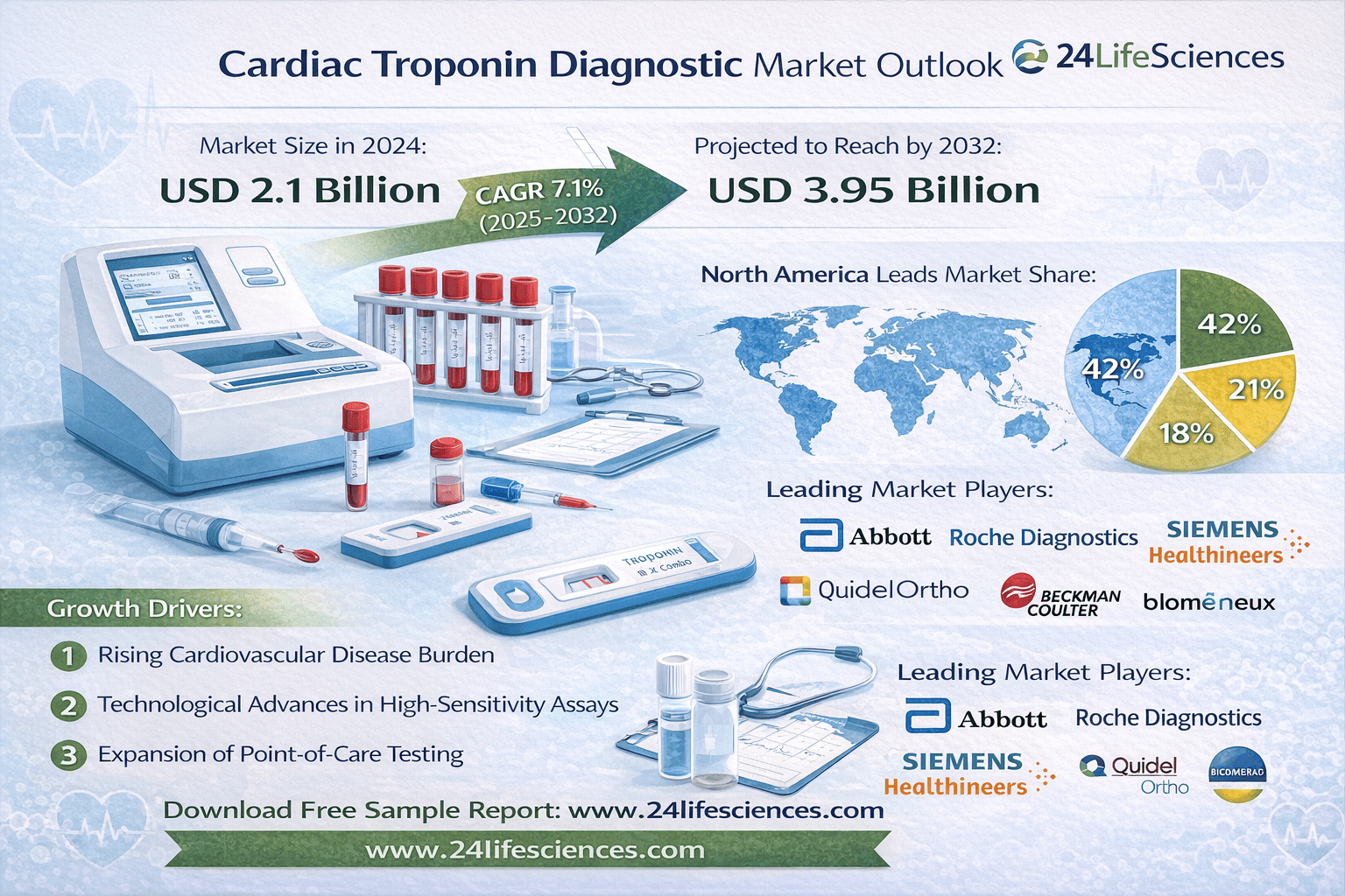According to a newly published market research report by 24LifeSciences, global cardiac troponin diagnostic market was valued at USD 2.1 billion in 2024 and is projected to reach USD 3.95 billion by 2032, growing at a compound annual growth rate (CAGR) of 7.1% during the forecast period 20252032.