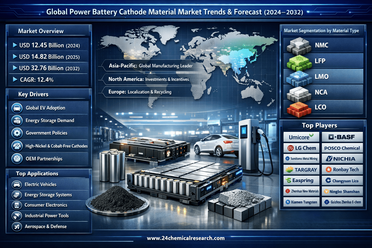 According to 24Chemical Research, Global power battery cathode material market size was valued at USD 12.45 billion in 2024. The market is projected to grow from USD 14.82 billion in 2025 to USD 32.76 billion by 2032, exhibiting a CAGR of 12.4% during the forecast period.