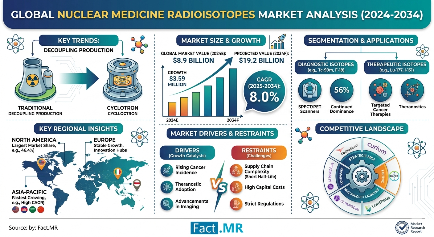 • Top Companies: GE HealthCare, Siemens Healthineers, Cardinal Health, Curium Pharma, Lantheus Holdings Inc., Jubilant Radiopharma, ITM Isotopen Technologien München, and NorthStar Medical Radioisotopes.