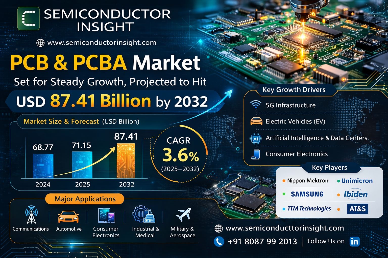 Global PCB & PCBA Market, valued at a strong USD 68.77 billion in 2024, is poised for steady growth, forecasted to increase from USD 71.15 billion in 2025 to USD 87.41 billion by 2032. This progression reflects a compound annual growth rate (CAGR) of 3.6%, as detailed in a new comprehensive report published by Semiconductor Insight. The study underscores the indispensable role of these foundational electronic components across virtually all modern technology sectors.