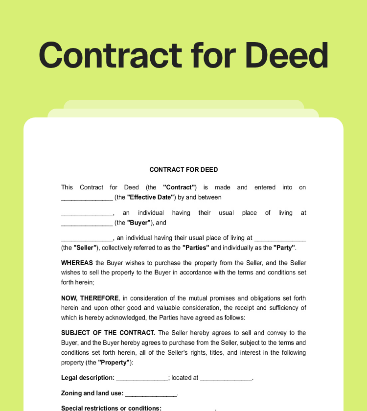 A Contract for deed is a type of real estate agreement where the seller finances the purchase of a property for the buyer. Instead of receiving the full payment upfront, the seller allows the buyer to make installment payments over time. During this payment period, the buyer usually lives in or uses the property while making scheduled payments.