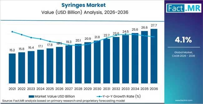 The global syringes market is entering a decade of sustained structural growth, projected to rise from USD 18.53 billion in 2026 to USD 27.69 billion by 2036. According to a definitive strategic analysis by FACT.MR, the industry is advancing at a 4.1% CAGR, driven by a global tightening of safety regulations, the rapid rise of self-administered biologics, and massive healthcare infrastructure investments in emerging economies.