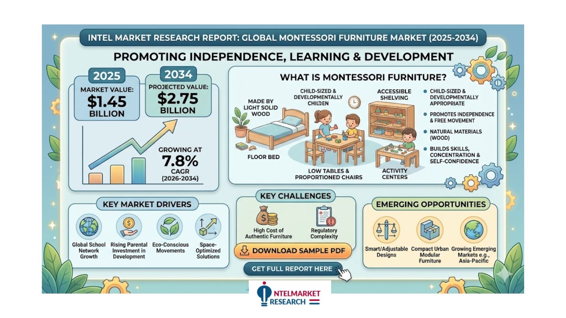 According to a new report from Intel Market Research, the global Montessori Furniture market was valued at USD 1.45 billion in 2025 and is projected to reach USD 2.75 billion by 2034, growing at a steady CAGR of 7.8% during the forecast period (2026-2034). This expansion reflects increasing global adoption of Montessori education principles, rising parental investment in child development, and growing awareness of the benefits of ergonomic learning environments.