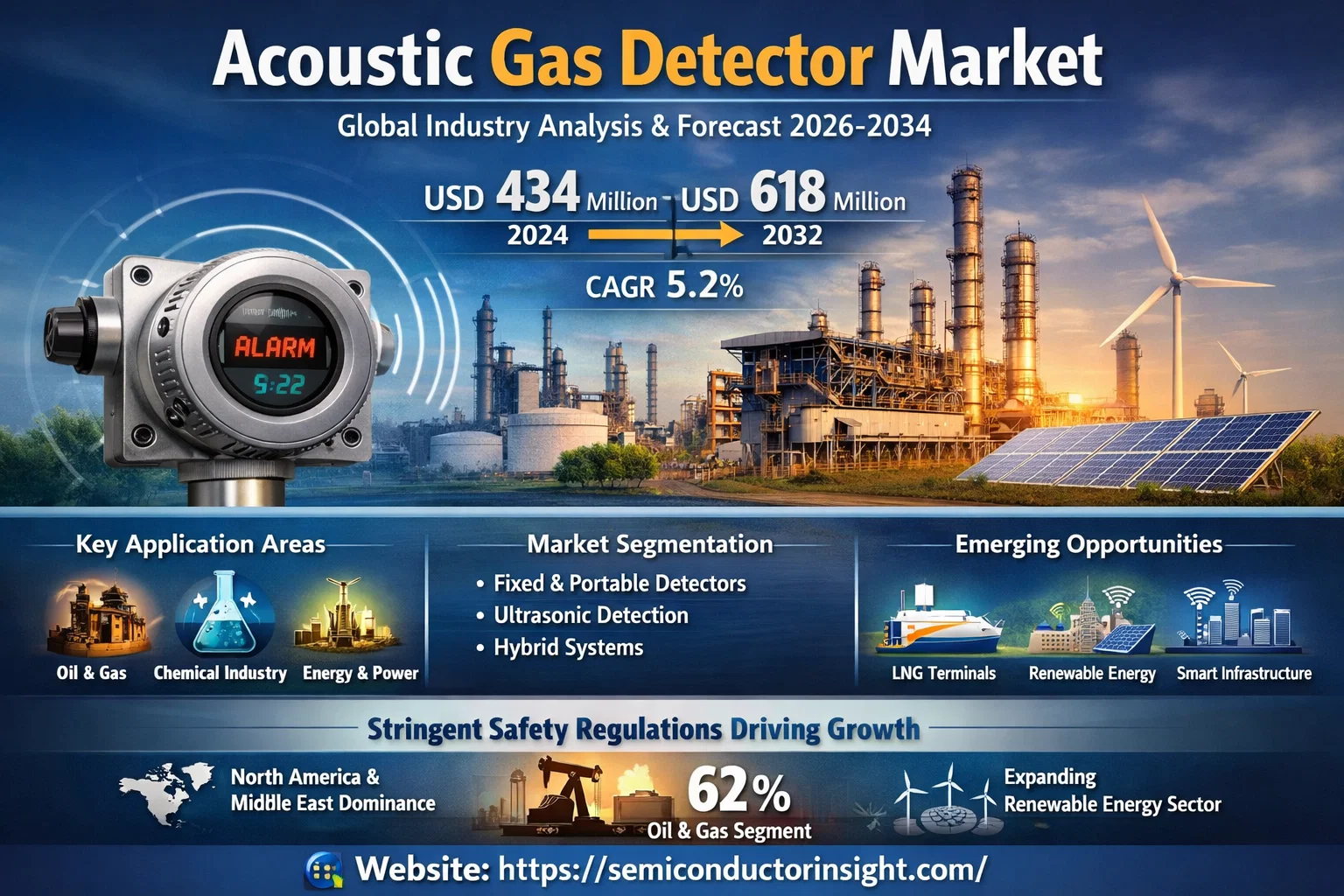 Global Acoustic Gas Detector Market, valued at a robust USD 434 million in 2024, is on a steady growth trajectory, projected to reach USD 618 million by 2032. This expansion, representing a compound annual growth rate (CAGR) of 5.2%, is detailed in a comprehensive new report published by Semiconductor Insight. The study underscores the critical importance of these advanced safety systems in detecting hazardous gas leaks across numerous high-risk industries, particularly oil & gas and chemical processing.