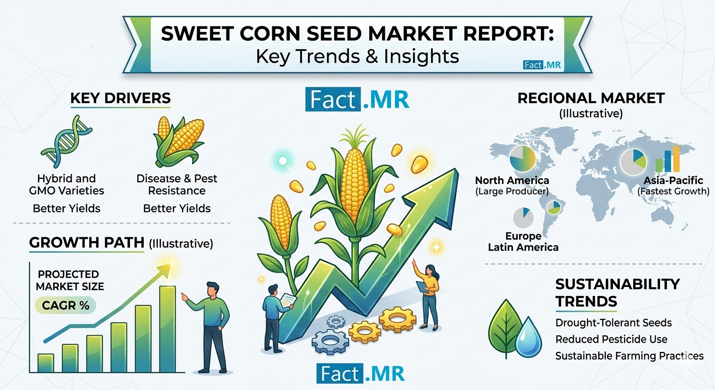 The global sweet corn seeds market is entering a transformative decade of growth, projected to rise from USD 1.8 billion in 2025 to USD 2.8 billion by 2035. According to the latest strategic outlook by FactMR, this 4.5% CAGR is underpinned by a fundamental shift toward advanced agricultural biotechnology, as producers prioritize yield optimization and climate adaptation to meet rising global food demands.
