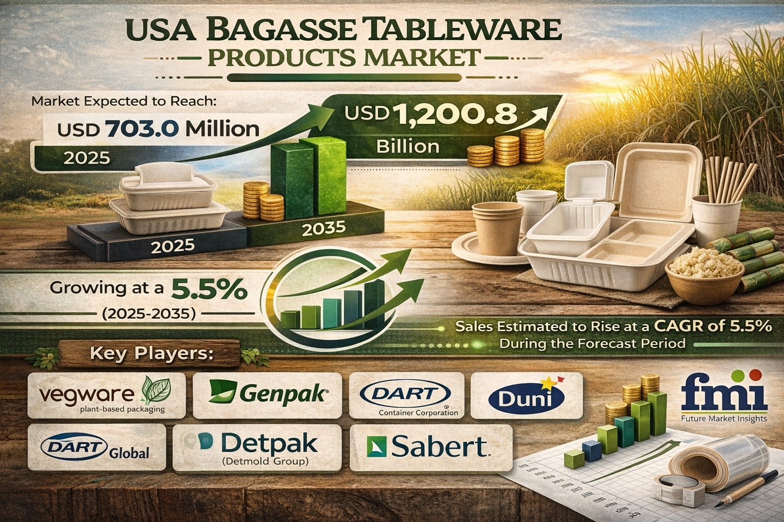 The USA bagasse tableware products market is gaining strong momentum as sustainability becomes a defining factor in foodservice and packaging decisions. In 2025, the market is expected to reach USD 703.0 million and is projected to expand to USD 1,200.8 million by 2035, registering a CAGR of 5.5%. This steady growth reflects a fundamental shift in how American businesses and consumers perceive disposable tableware.