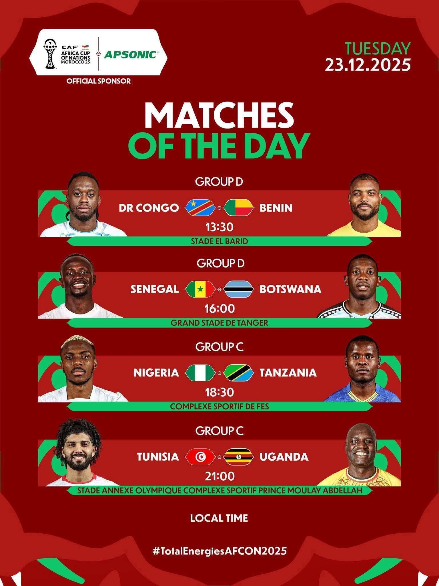 #sportivo🔥 PROGRAMME DU JOUR – CAN MAROC 2025 🔥 📅 Mardi 23 décembre 2025 🏆 TotalEnergies AFCON 2025 ⚔️ GROUPE D 🕜 13h30 — 🇨🇩 RD Congo 🆚 🇧🇯 Bénin 🏟️ Stade El Barid 🕓 16h00 — 🇸🇳 Sénégal 🆚 🇧🇼 Botswana 🏟️ Grand Stade de Tanger ⚔️ GROUPE C 🕡 18h30 — 🇳🇬 Nigeria 🆚 🇹🇿 Tanzanie 🏟️ Complexe Sportif de Fès 🕘 21h00 — 🇹🇳 Tunisie 🆚 🇺🇬 Ouganda 🏟️ Complexe Prince Moulay Abdellah 💬 QUI VA FRAPPER FORT AUJOURD’HUI ? 👉 Donne tes pronostics en commentaires 🔔 Abonne-toi pour les buts, résultats et infos CAN en temps réel ! #CAN2025 #TotalEnergiesAFCON2025 #CanMaroc2025 #AFCON2025 #sportivo0 Comments 0 Shares 15 Views 0 Reviews