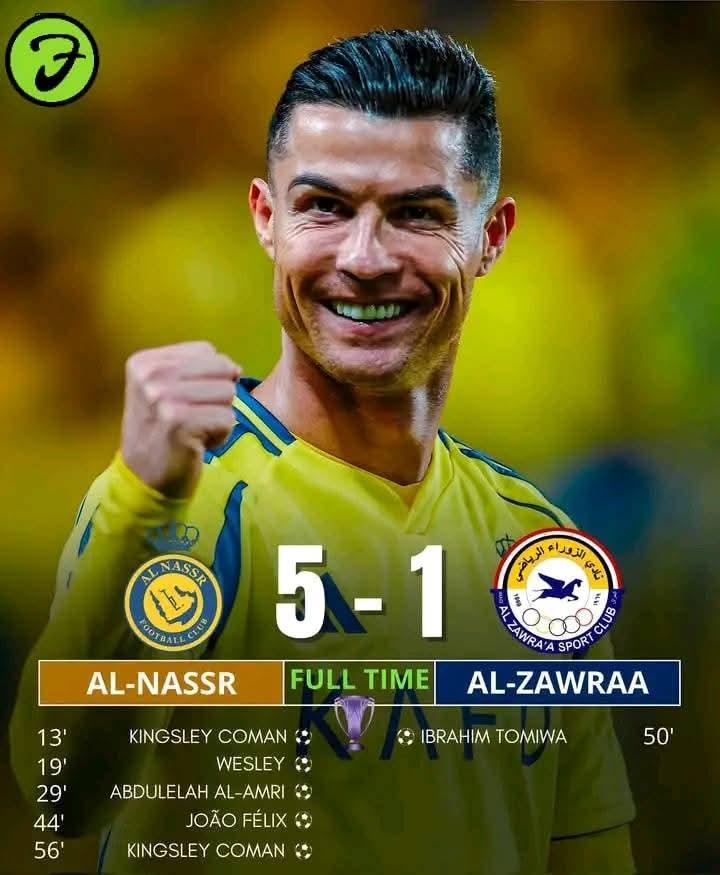 #sportivo🟡 Al-Nassr 5-1 Al-Zawraa 🔵 (AFC Champions League Two, Group D, Round 6) ⏰ 13' Kingsley Coman ⚽️ ⏰ 19' Wesley ⚽️ ⏰ 29' Abdulelah Al-Amri ⚽️ ⏰ 44' João Félix ⚽️ ⏰ 56' Kingsley Coman ⚽️ ⏰ 50' Ibrahim Tomiwa ⚽️ Ronaldo Assists in Al-Nassr's 5-1 Rout After Layoff 𝐀𝐋 𝐍𝐀𝐒𝐒𝐑 𝐑𝐄𝐓𝐔𝐑𝐍 𝐓𝐎 𝐀𝐂𝐓𝐈𝐎𝐍 𝐈𝐍 𝐒𝐓𝐘𝐋𝐄 😮💨🔥 🅰️ Assist for Cristiano 👉 ⚽🅰️ for unstoppable João Félix ⚽⚽ for Coman ⚽ Wesley & Al Amri on the scoresheet too ✌️ Al Nassr finish the AFC Champions League 2 group stage flawless, taking 18 points from 6 games 🫡 Still perfect in the Saudi Pro League too, which resumes this weekend. Eyes on the double 👀🏆🏆 — #AlNassr #AlZawraa #AFC #football #soccer #footflix #footflix90 #explore #viral #trending #fyp #futbol #sportivo0 Comments 0 Shares 354 Views 0 Reviews -