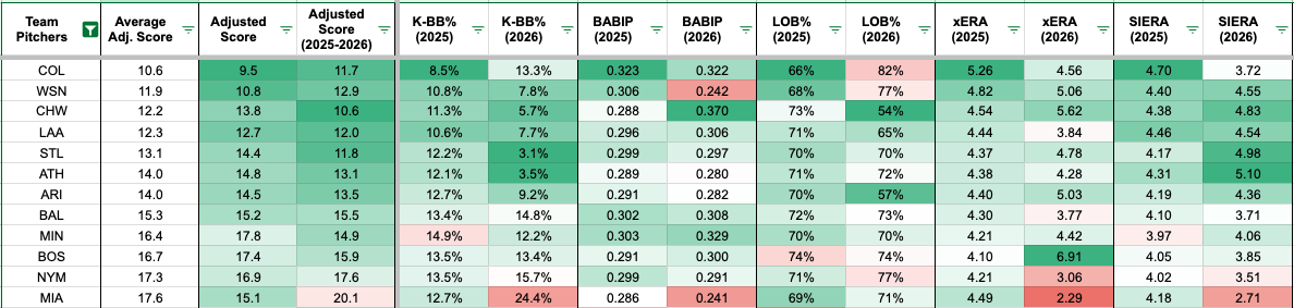SPORTS.YAHOO.COMFantasy Baseball Waiver Wire: Hitter matchups to exploit and stream in Week 3, based on advanced statsIn last weeks article, we introduced the following adjusted scores as a way to quantify team pitching matchups for opposing hitters. We used several team-level advanced metrics to weigh and adjust scores. For fun, we included the first week of 2026. However, the 2026 numbers arent weighted as much, compared to the significantly larger 2025 sample, as a way to show any early-season differences.A lower adjusted score indicates the hitting matchup should be more favorable against those team pitchers. The opposite is true, where a higher adjusted score suggests teams facing these pitchers may face challenges in their upcoming matchups. We used conditional formatting to indicate that the projected easier matchups should be green and the tougher matchups should be shaded red.The visual below shows the top 12 easiest projected matchups for hitters heading into Week 3.Easiest adjusted hitter matchups for Week 3. (Photo by Corbin Young/Yahoo Sports)Another way to look at the visual above is that these pitchers tend to be the worst pitching staffs. The worst teams include the Rockies, Nationals, White Sox, Angels and Cardinals. However, its worth highlighting the significant 2026 differences (small-sample alert!) for Marlins starting pitchers across the board. The underlying metrics for Sandy Alcantara and Eury Prez have been juicy, though dont sleep on Janson Junk in the early 2026 sample.The visual below shows the top 12 toughest projected matchups for hitters heading into Week 3.Hardest adjusted hitting matchups for Week 3. (Photo by Corbin Young/Yahoo Sports)Meanwhile, the most challenging team pitchers to face includethe Astros, Brewers, Dodgers, Yankees and Mariners. In the small 2026 sample, weve seen the Brewers, Yankees and Mariners have their K-BB% improve compared to 2025. However, hopefully, the above metrics are just early-season noise for the Rays and Reds.Well look at a few Week 3 hitter matchups to monitor. Additionally, well highlight several hitters to consider adding based on their matchups, skills and playing time.Seven-Game Slates in Week 3Reds (4 at MIA, 3 vs. LAA)Most of the lineup doesnt platoon, except for Will Benson. We discussed how Marlins starting pitchers have been performing better early in 2026, so it might be slightly more challenging for Reds hitters. However, only Jos Soriano somewhat scares us when facing Angels starting pitchers.Rockies (3 vs. HOU, 4 at SD)Three games at home and four on the road for Rockies hitters. They have the second-most stolen bases in the early 2026 sample, so maybe fantasy managers can stream stolen bases from Rockies hitters.White Sox (3 vs. BAL, 4 at KC)There will be volume in favor of White Sox hitters. However, theyll face Trevor Rogers, Kyle Bradish, Kris Bubic and Cole Ragans, making it somewhat of a mixed bag from a matchup standpoint.Tigers (4 at MIN, 3 vs. MIA)They project to face seven right-handed pitchers in Week 3. That should favor Colt Keith and Kerry Carpenter as strong-side platoon options. Keith and Carpenter should be viable hitter options to start in most formats.Royals (3 at CLE, 4 vs. CWS)In the first half of the week, Kansas City faces Tanner Bibee, Gavin Williams and Joey Cantillo. However, the second half of Week 3 looks profitable with Anthony Kay, Davis Martin, Erick Fedde and Shane Smith. With right-handed pitchers projected in five out of seven games, keep an eye on Jac Caglianone and Kyle Isbel as strong-side platoon options.Marlins (4 vs. CIN, 3 at DET)Be cautious with Liam Hicks and playing time because of the platoon concerns. They project to face a Reds starting rotation with three lefties in four games and one lefty (Tarik Skubal) in the final three games against Detroit.Twins (4 vs. DET, 3 at TOR)Minnesota faces right-handed pitchers in four out of seven games, especially early in the week against Skubal and Framber Valdez. Matt Wallner has been earning chances against left-handed pitchers in 2026, with Kody Clemens and Trevor Larnach losing plate appearances against lefties.Padres (3 at PIT, 4 vs. COL)The Padres lineup to face right-handed pitchers in all seven games in Week 3. Gavin Sheets remains the only strict strong-side platoon option. Sheets has a 103 wRC+ against right-handed pitchers with a 54 wRC+ against lefties in his career.Three Week 3 Strong-Side Platoons to MonitorDominic Canzone, 12% Rostered (3 at TEX, 3 vs. HOU)We mentioned last week that Dominic Canzone remains a strong-side platoon option. Canzone projects to face five right-handed pitchers out of six games in Week 3. The Mariners have been using a strict platoon for Canzone in the early set of games. Canzone has shown better bat speed (74.6 mph) in 2026, supported by a 52% fast swing rate (percentage of swings at 75 mph or faster). He should be a strong source of power, especially in weekly matchups where he projects to face plenty of right-handed pitchers.Dominic Canzone bat speed analysis. (Photo by Corbin Young/Yahoo Sports)Colt Keith, 20% Rostered (4 at MIN, 3 vs. MIA)Colt Keith has been hitting atop the lineup for the Tigers, projecting as a strong-side platoon option. They project to face all right-handed pitchers across their seven game slate. Keith has been a solid source of batting average, with a career .261 BA. However, Keiths current .556 BABIP has inflated his .417 BA. Keith showed a 73.6 mph bat speed in 2026, potentially hitting for more power, paired with a strong batting average floor. Fantasy managers should stream Keith in medium and deeper formats.Colt Keith 15-game rolling average and BABIP. (Photo by Corbin Young/FanGraphs)Evan Carter, 5% Rostered (3 vs. SEA, 3 at LAD)Defense is Evan Carters calling card, but theres some power and speed in his fantasy profile. Carter projects as a strong-side platoon option, and the Rangers face six right-handed pitchers in Week 3. Theoretically, Carter can