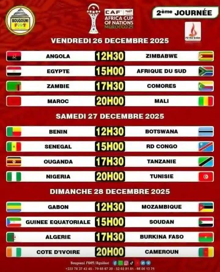 #sportivo#Can2025 (JOURS 2) : PROGRAMME COMPLETE 🌟 VENDREDI : 26/12/2025 🕒14:30 🌍 Angola 🇦🇴 vs 🇿🇼 Zimbabwe 🕒17:00 🌍 Egypt 🇪🇬 vs 🇿🇦 S. Africa 🔥 🕒19:30 🌍 Zambia 🇿🇲 vs 🇰🇲 Comoros 🕒22:00 🌍 Morocco 🇲🇦 vs 🇲🇱 Mali 🔥 🌟SAMEDI : 27/12/2025 🕒14:30 🌍 Benin 🇧🇯 vs 🇧🇼 Botswana 🕒17:00 🌍 Senegal 🇸🇳 vs 🇨🇩 DRCongo🔥 🕒19:30 🌍 Uganda 🇺🇬 vs 🇹🇿 Tanzania 🕒22:00 🌍 Nigeria 🇳🇬 vs 🇹🇳 Tunisia 🔥 🌟 DIMANCHE : 28/12/2025 🕒14:30 🌍 Gabon 🇬🇦 vs 🇲🇿 Mozambique 🕒17:00 🌍 Eq. Guinea 🇬🇶 vs 🇸🇩 Sudan 🕒19:30 🌍 Algeria 🇩🇿 vs 🇧🇫 Burkina 🔥 🕒22:00 🌍 Ivory C.🇨🇮 vs 🇨🇲Cameroon 🔥 Abonnes toi et sois informé en temps réel 👉 Le football d'abord #ScoreEnDirect #sportivo0 Yorumlar 0 hisse senetleri 19 Views 0 önizleme