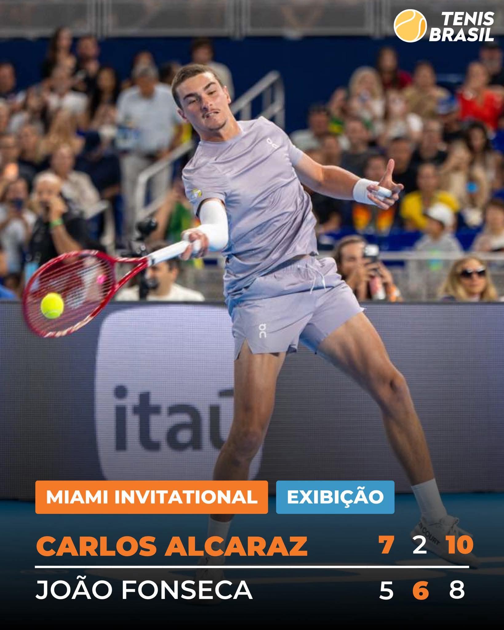 O tão aguardado duelo entre Carlos Alcaraz e João Fonseca aconteceu nesta segunda-feira no Miami Tennis Invitational, exibição realizada no LoanDepot Park, estádio do time de beisebol Miami Marlins. O espanhol prevaleceu no final e venceu o brasileiro com parciais de 7/5, 2/6 e 10-8