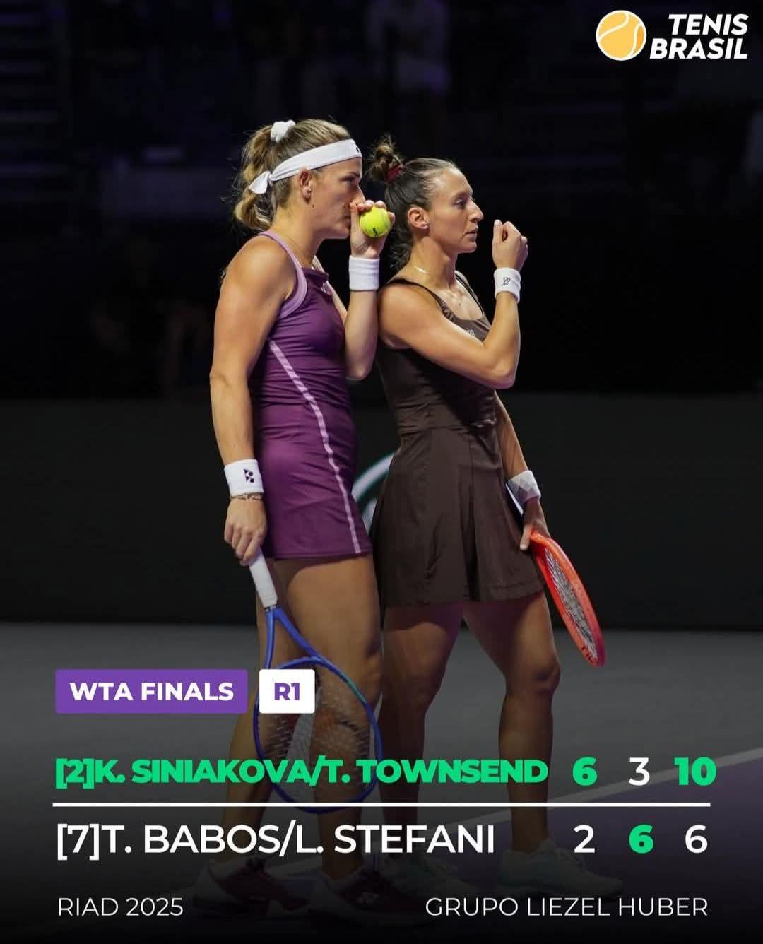 Disputando seu primeiro WTA Finals, a paulista Luisa Stefani estreou com derrota na competição que reúne as oito melhores duplas da temporada. Ela e a húngara Timea Babos enfrentaram logo de cara a segunda principal parceria do ano, formada pela tcheca Katerina Siniakova e a norte-americana Taylor Townsend, e foram superadas pelo placar de 6/2, 3/6 e 10-6, em 1h27 de partida.