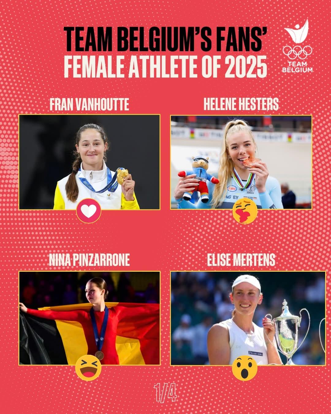 Who will be Team Belgium’s Female Athlete of the Year? (1/4) 🔥Vote now! Every 24 hours at 5PM, pick your favorite from 4 incredible athletes by emoji and send them to the finals at this month’s end! ❤️, Picture On wheels or on ice, Fran is comfortable everywhere. Belgian records on ice, GOLD SILVER BRONZE BRONZE at the World Games in roller sports. And let’s add a European roller title on the 1,000m. Leave some for the others, Fran! 🥰 Helene Hesters is the queen of the elimination race. World bronze and European silver. Oh—she also broke the world record in the 4km! 😆 Another European bronze medal for Nina Pinzarrone! She now belongs among the world’s figure-skating elite. 😮 Elise Mertens is exceptional in singles or doubles and on every surface! Two WTA singles titles, plus Wimbledon and the WTA Finals in doubles. #sportivo