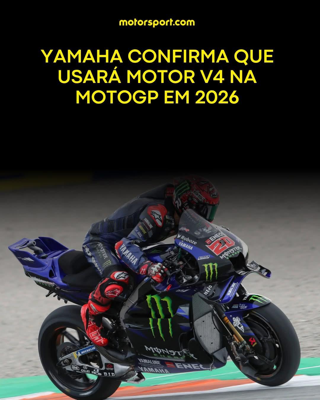 O V4 VEM AÍ! A Yamaha confirmou neste domingo que utilizará o motor V4 em suas motos a partir da temporada 2026 da MotoGP. Assim, o GP de Valência deste domingo marcou o fim de uma era para a marca japonesa, que era a última do grid a utilizar os motores quatro em linha #MotoGPnoMotorsport