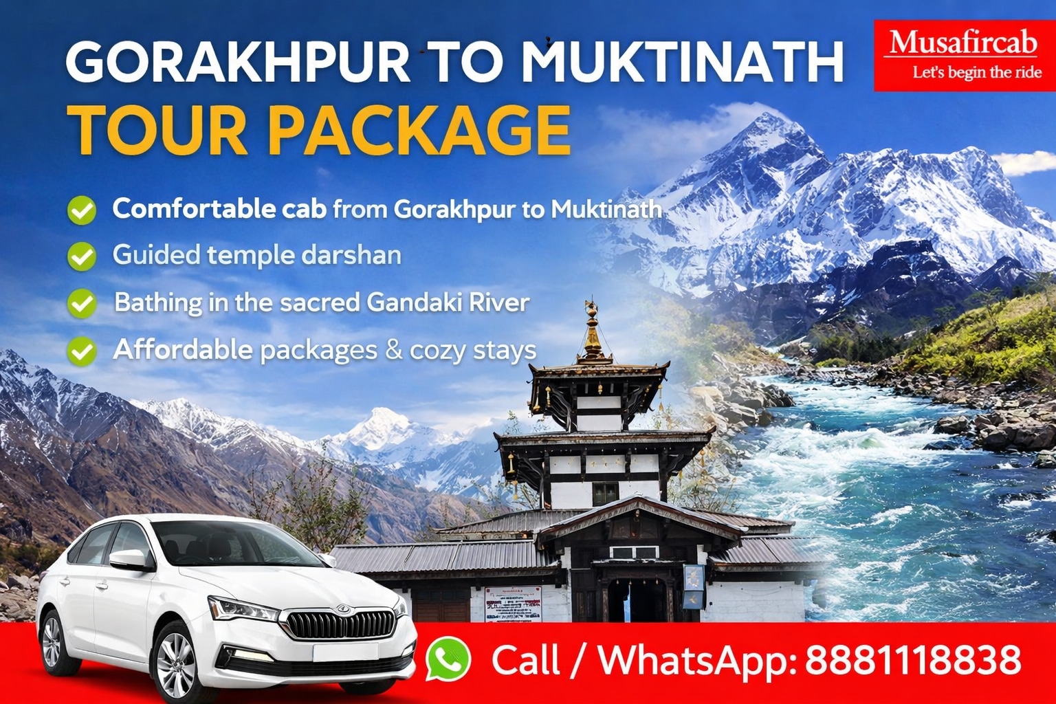 Discover the divine beauty and breathtaking natural landscapes of Muktinath Dham with Musafircab. Our Gorakhpur to Muktinath Tour Package lets you experience spiritual peace while exploring the most famous attractions of Muktinath and Nepal.
