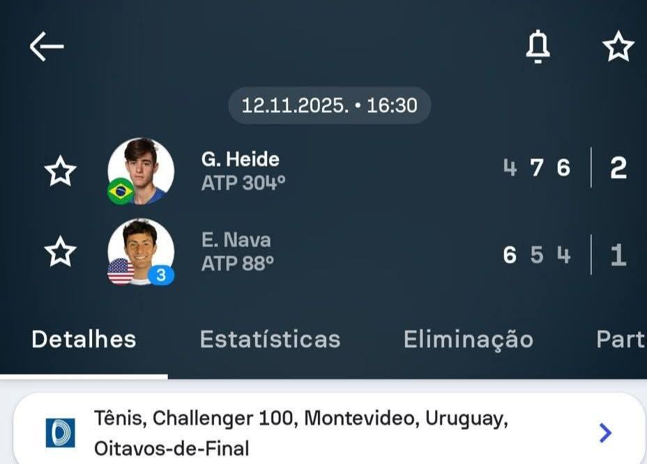• Numa virada sensacional, Gustavo Heide bateu o Emiliano Nava, número 88 do mundo e 3 cabeça de chave do Challenger 100 de Montevideo, passou pras quartas de final e busca se reabilitar depois de uma séria lesão no começo do ano.