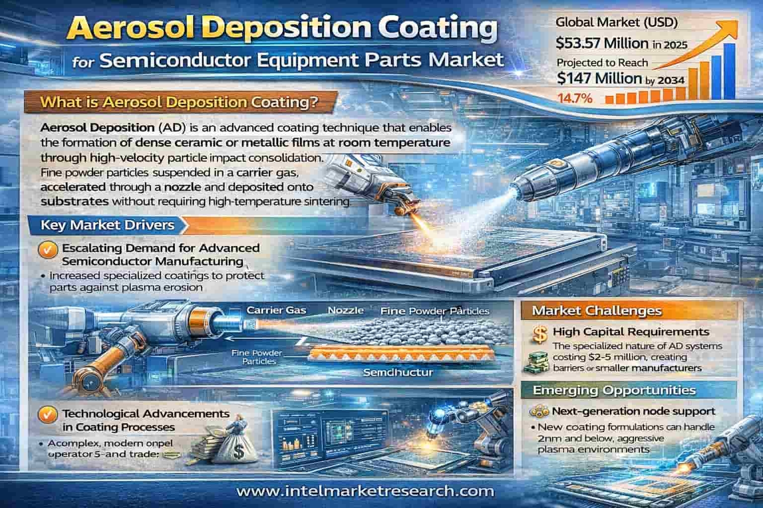 According to a new report from Intel Market Research, the global Aerosol Deposition Coating for Semiconductor Equipment Parts market was valued at USD 53.57 million in 2025 and is projected to reach USD 147 million by 2034, growing at a robust CAGR of 14.7% during the forecast period (2025-2034).