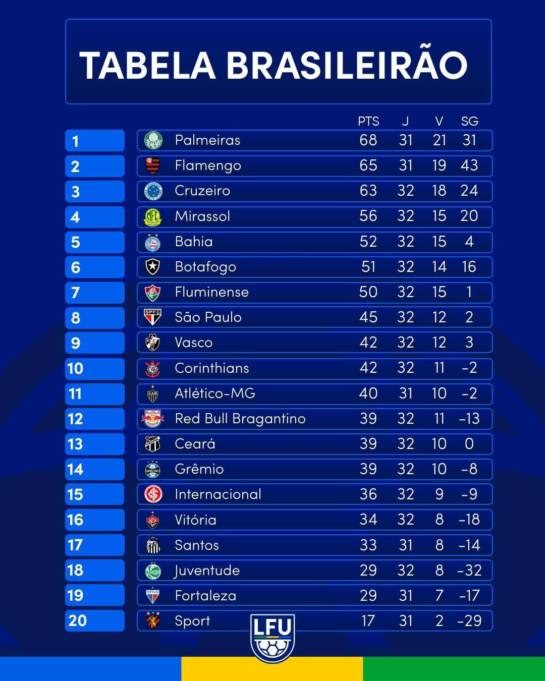 Na última rodada, o Flamengo venceu o Santos no Maracanã e encostou na liderança. O Palmeiras perdeu fora de casa para o Mirassol e viu o rival carioca empatar em pontos. Quem será o campeão?