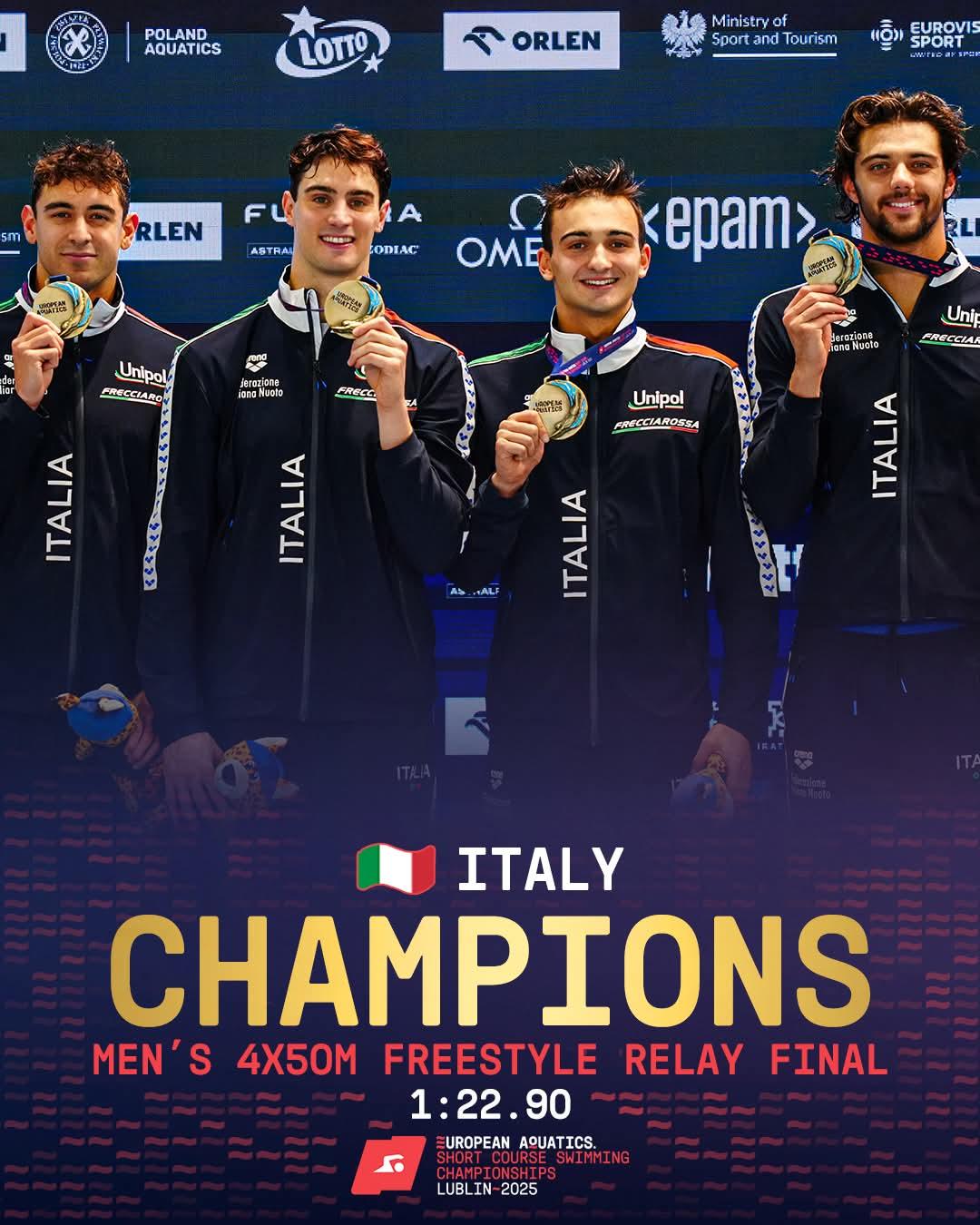 Italy 🇮🇹 lead in the Men's 4x50m Freestyle Relay with a time of 1:22.90! Poland and Croatia follow behind in the last final of day 1 in Lublin! 🏊‍♂️ #EuropeanAquatics #Swimming #sportivo
