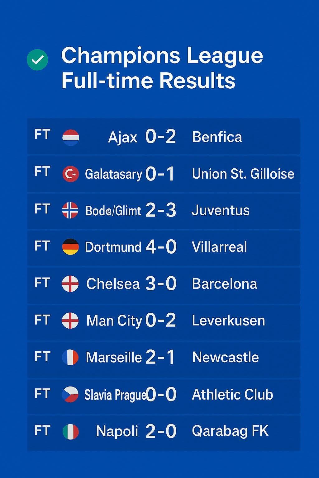 🔕 Champions League – Full-time Results FT⏰ 🇳🇱 Ajax 0–2 Benfica 🇵🇹 FT⏰ 🇹🇷 Galatasaray 0–1 Union St. Gilloise 🇧🇪 FT⏰ 🇳🇴 Bodø/Glimt 2–3 Juventus 🇮🇹 FT⏰ 🇩🇪 Dortmund 4–0 Villarreal 🇪🇸 FT⏰ 🇬🇧 Chelsea 3–0 Barcelona 🇪🇸 FT⏰ 🇬🇧 Man City 0–2 Leverkusen 🇩🇪 FT⏰ 🇫🇷 Marseille 2–1 Newcastle 🇬🇧 FT⏰ 🇨🇿 Slavia Prague 0–0 Athletic Club 🇪🇸 FT⏰ 🇮🇹 Napoli 2–0 Qarabag FK 🇦🇿 #UCL #FootballResults #EuropeanNights #MatchDay #FullTime #UCLResults #SoccerUpdates #Fotmob #nrsportscorner