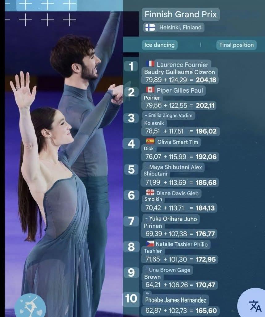 Laurence Fournier-Beaudry and Guillaume Cizeron won the Grand Prix in Finland. 🥇 1. Laurence Fournier-Beaudry and Guillaume Cizeron (France) – 204.18 2. Piper Gilles and Paul Poirier (Canada) – 202.12 3. Emilia Zingas and Vadim Kolesnik (USA) – 196.02