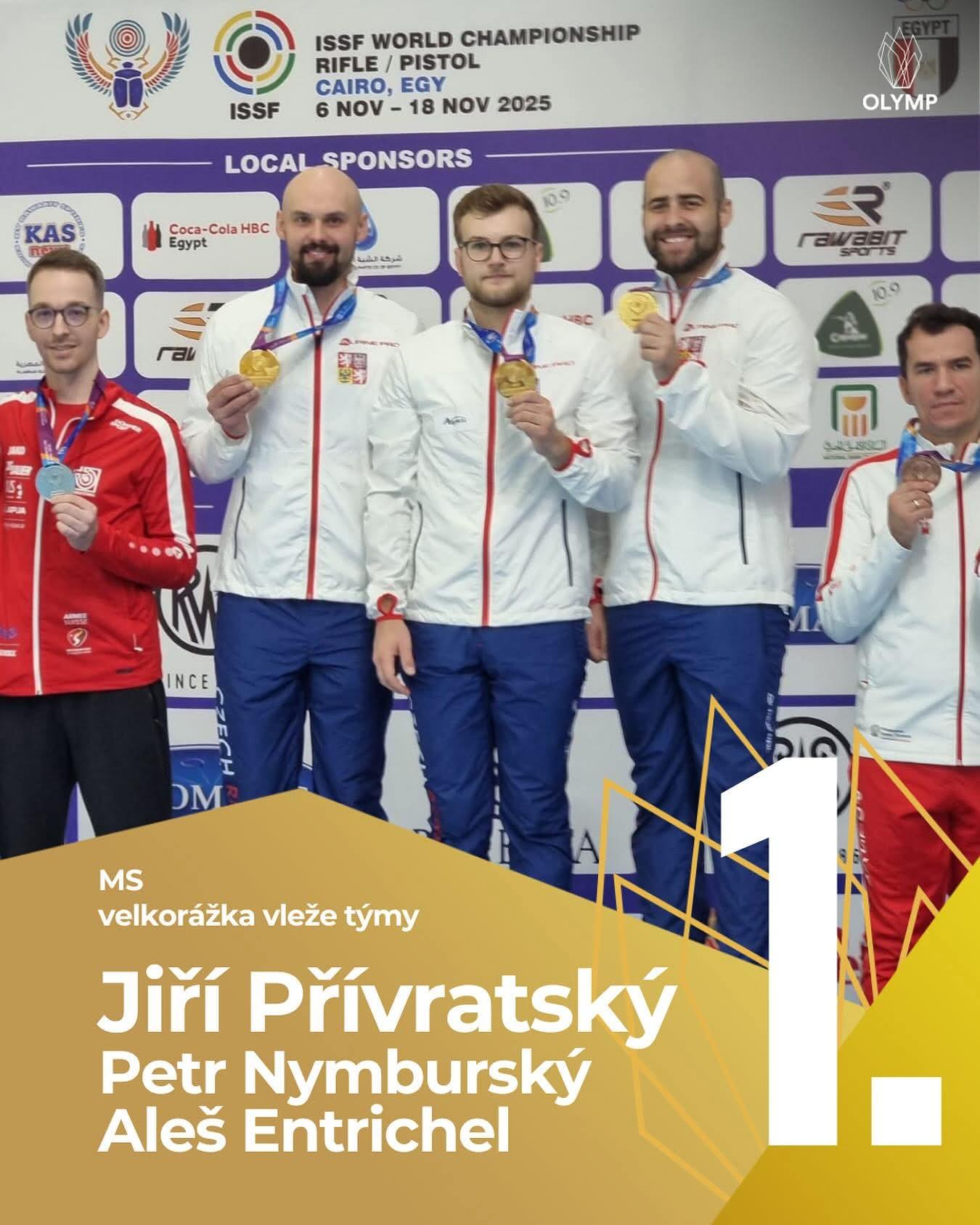 👑 Petr Nymburský je mistrem světa! 🥇 A letos dokonce dvojnásobným. V Káhiře ovládl střelbu z velkorážní pušky v leže a společně s Jiří Přívratským a Alešem Entrichelem získal titul i mezi týmy. 🇨🇿 V této disciplíně se střílí na 300 metrů, přesto Petr zaznamenal 597 bodů z 600 možných. A hned ve 40 případech trefil desítku. Právě to mu zajistilo zasloužené zlato. Dvojnásobný olympionik je šampionem už z MS 2023 v Baku a nyní si k této zlaté medaili vystřílel dvě egyptské sestřičky. Skvělá práce,Petře. Skvělá práce, pánové! 🙌🏻