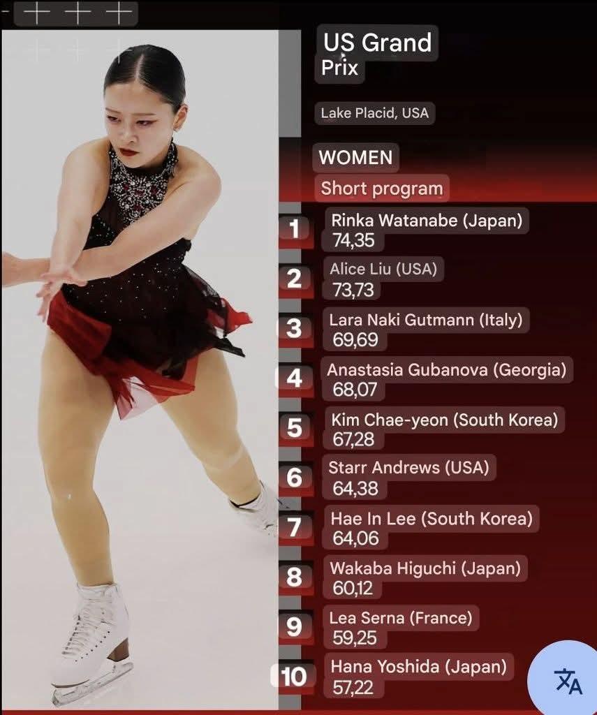 • Rinka Watanabe leads the short program at the U.S. Grand Prix with a clean triple Axel, scoring 74.35 points. Liu is second, Gutmann is third, and Gubanova is fourth.