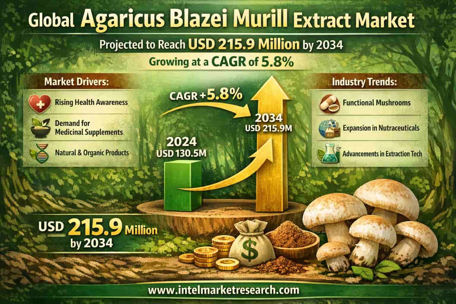 Global Agaricus Blazei Murill Extract Market Projected to Reach USD 215.9 Million by 2034, Growing at a CAGR of 5.8%; Key Players and Trends